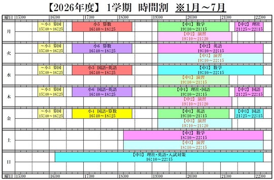 ※ 2026年1月から,以下の2026年度・新学年の時間割になります。